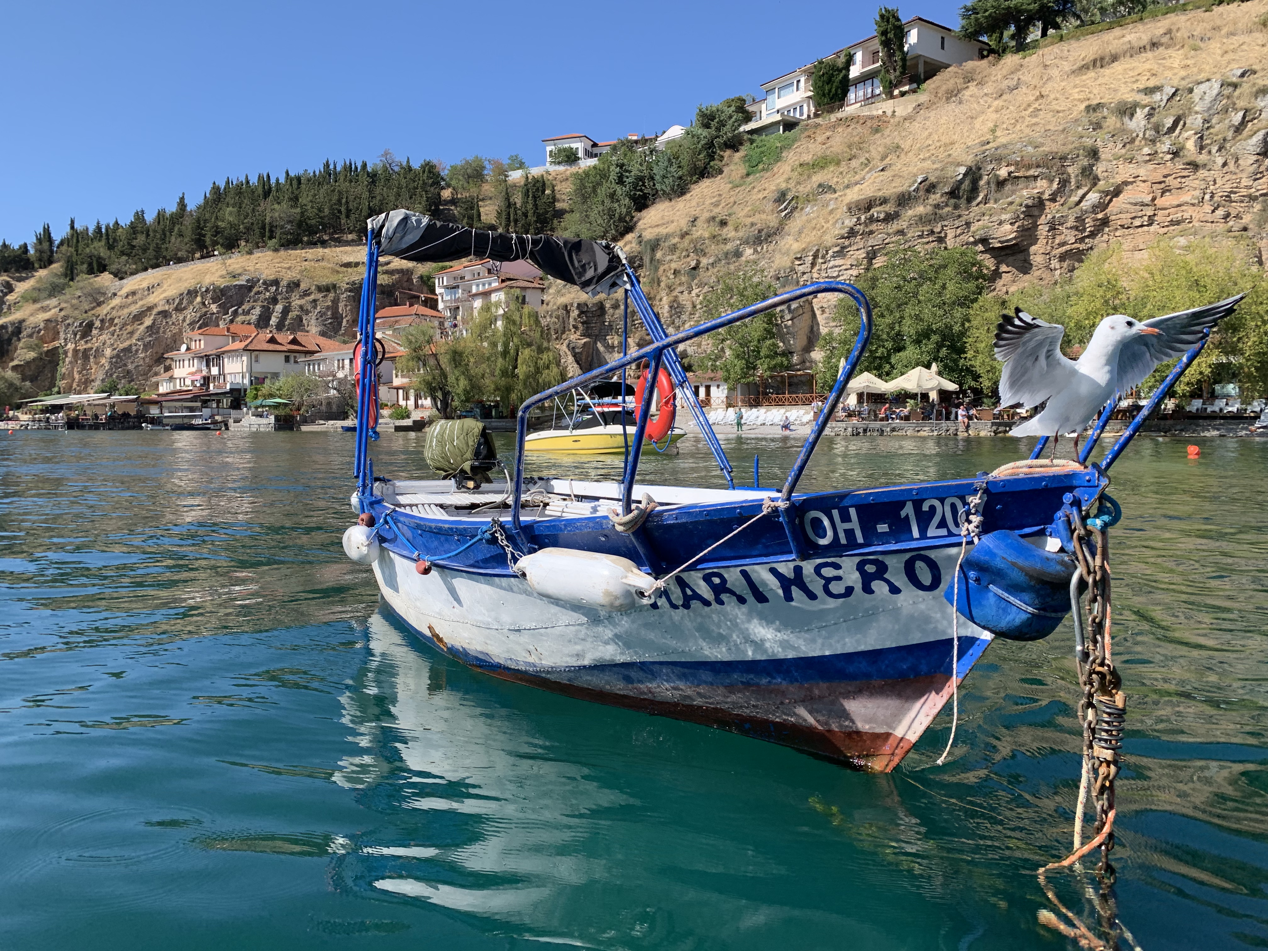 Lake Ohrid is stunning, beautiful water and beautiful views. It’s one of the oldest lakes in the world at over 1 million years old, and the oldest in Europe. At its deepest point it’s 288 metres deep. You can see the beautiful Albanian mountains across the lake. Two thirds of the lake belongs to Macedonia, the remaining third belongs to Albania.