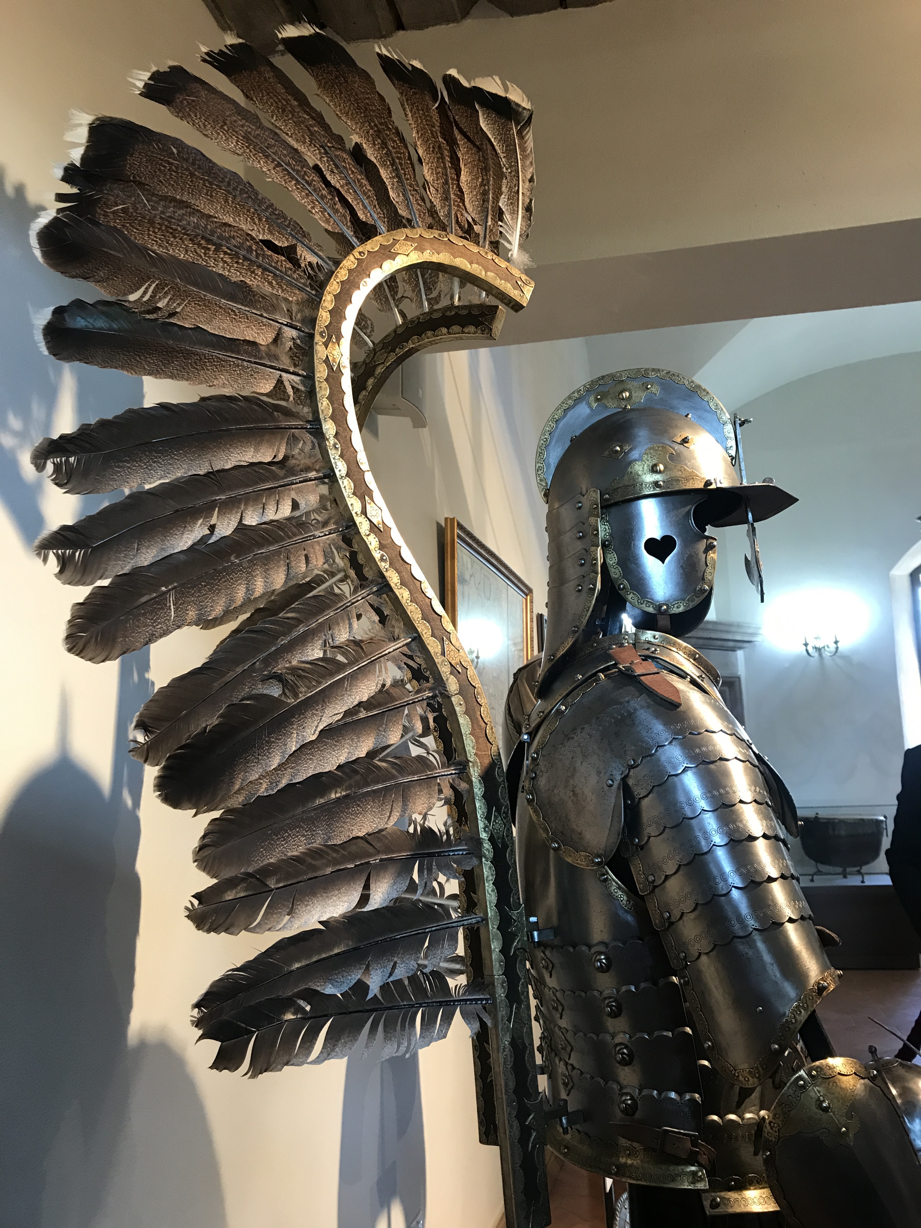It’s said that soldiers mounted these metal frames with feathers on to there armour when going into battle. The noise they created when riding on a horse would startle and frighten the enemies horses as they approached, giving an advantage during the battle.